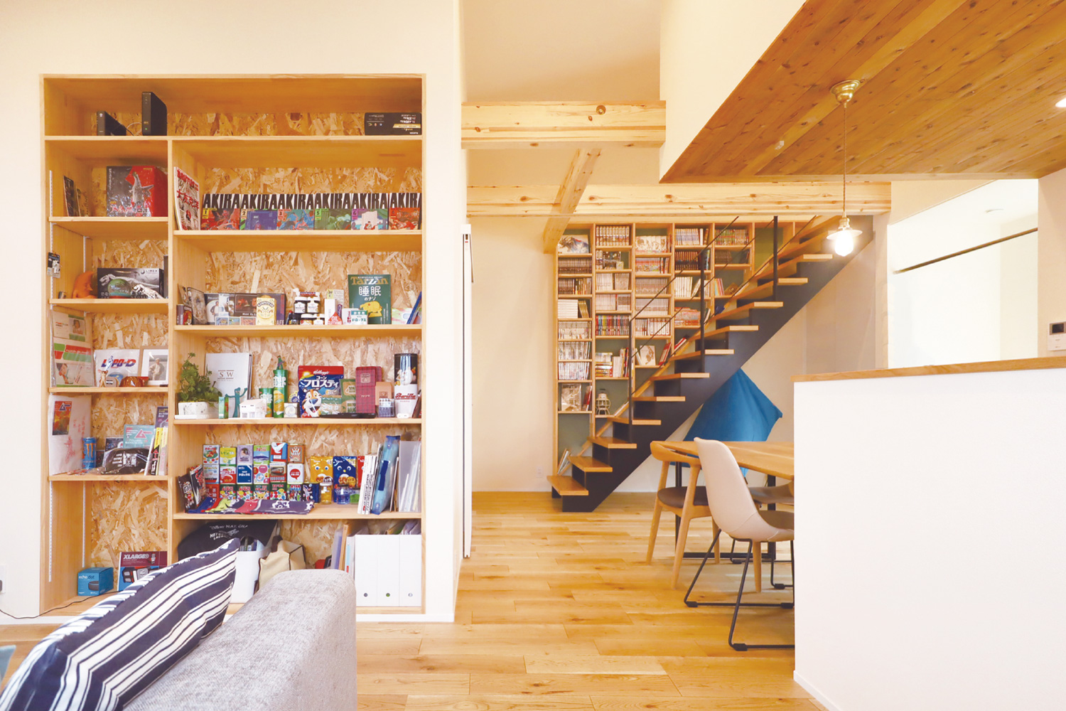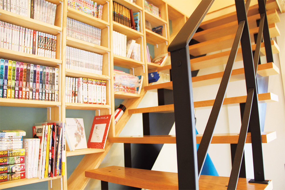 というK様のご希望を叶えつつ、限られたスペースを無駄なく活用するため、二階とロフトを繋ぐ階段を本棚と一つにしました。本棚がインテリアの一つとなって、お家全体のデザイン性を高めています。