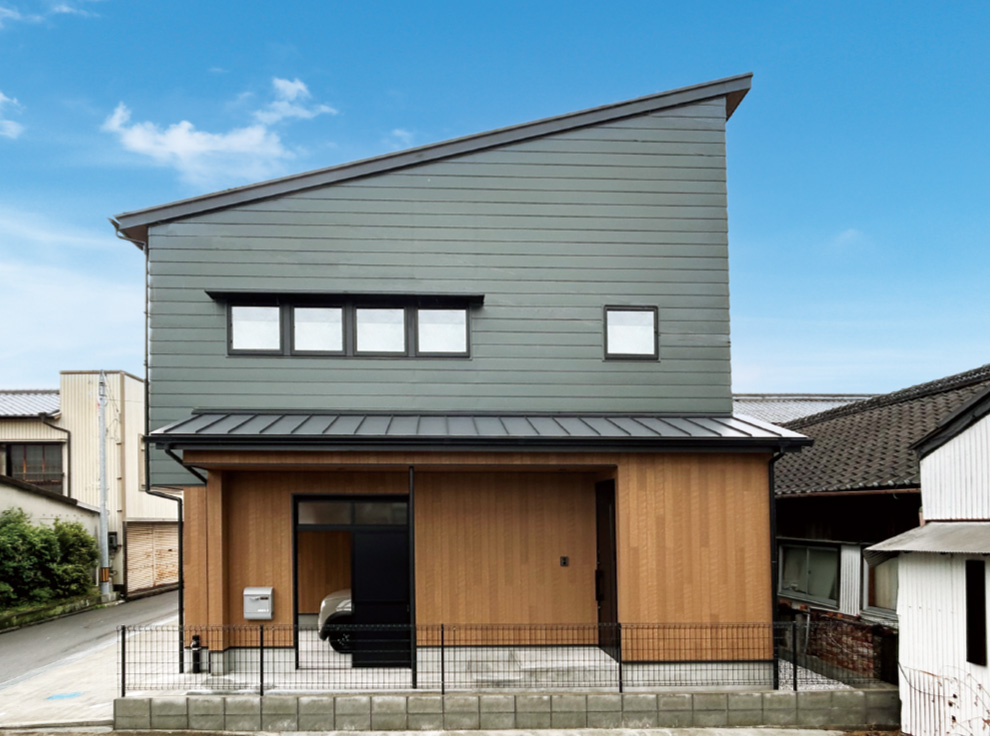 モスグリーンのガルバリウム鋼板と木目のスタイリッシュな外観が目を惹くK様邸に取材に伺いました。