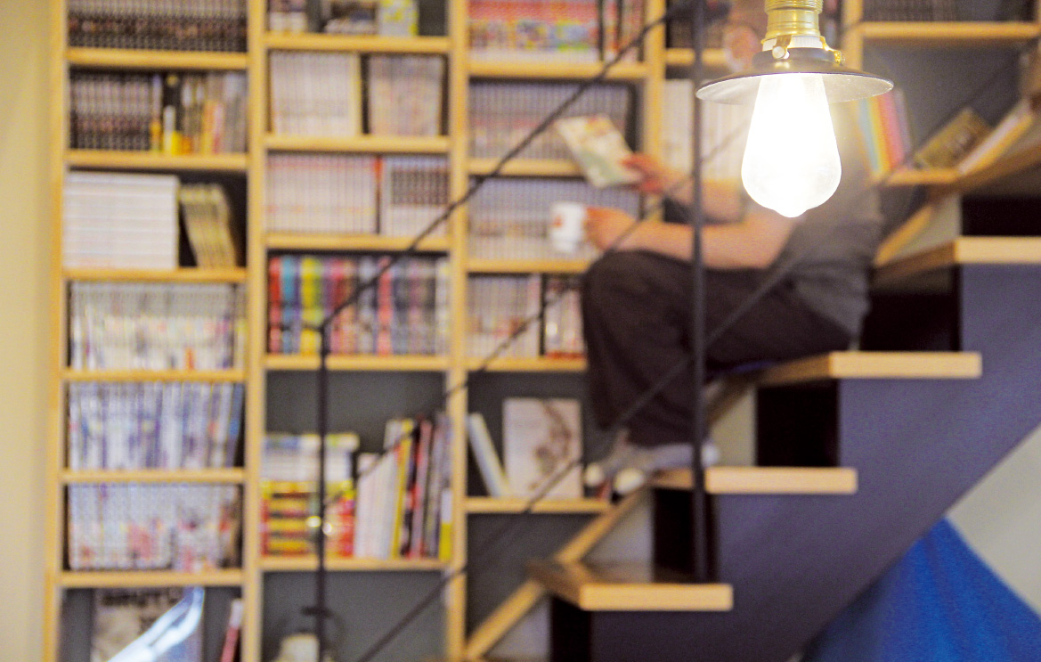 また、気になる本を手に取って、そのまま階段に腰掛けて読書を楽しむ---